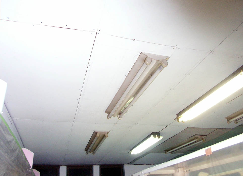 温室状態の中、暑さと戦いながら何とか天井板張りができました。次はジョイントテープを張ってパテ、シーラー上塗りをして仕上げていきます。あの穴ぼこだらけの天井がスッキリです。流した汗はどれだけでしょうか。あとは古い蛍光灯が交換できるといいのですが。これまた大変です。これは少し置いといて、棚をを作ると楽しい作業が待っています。オープンまで3週間です。