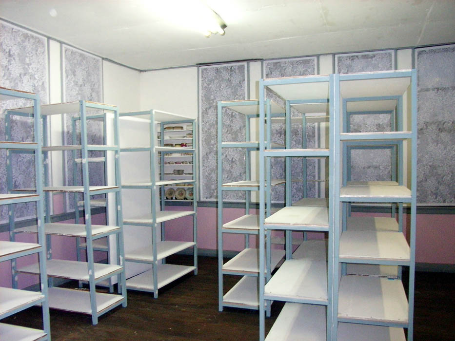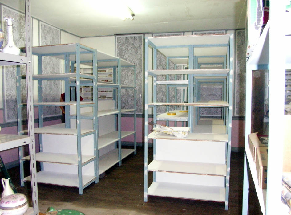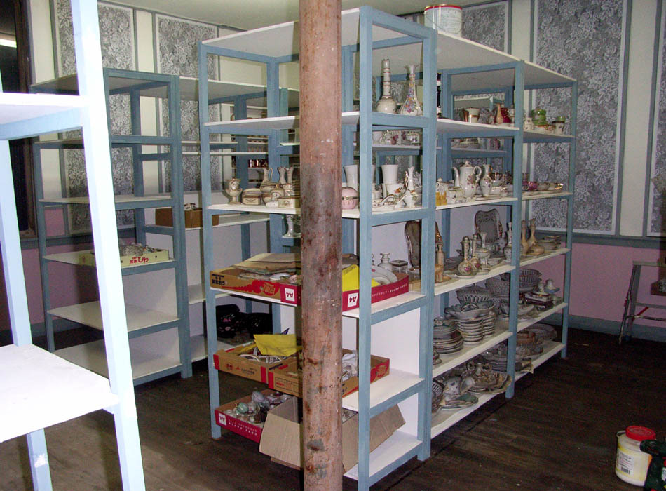 棚を配置してサンプルを陳列していきます。1階の棚が出来上がると、次は大仕事2階の天井の補修です。
