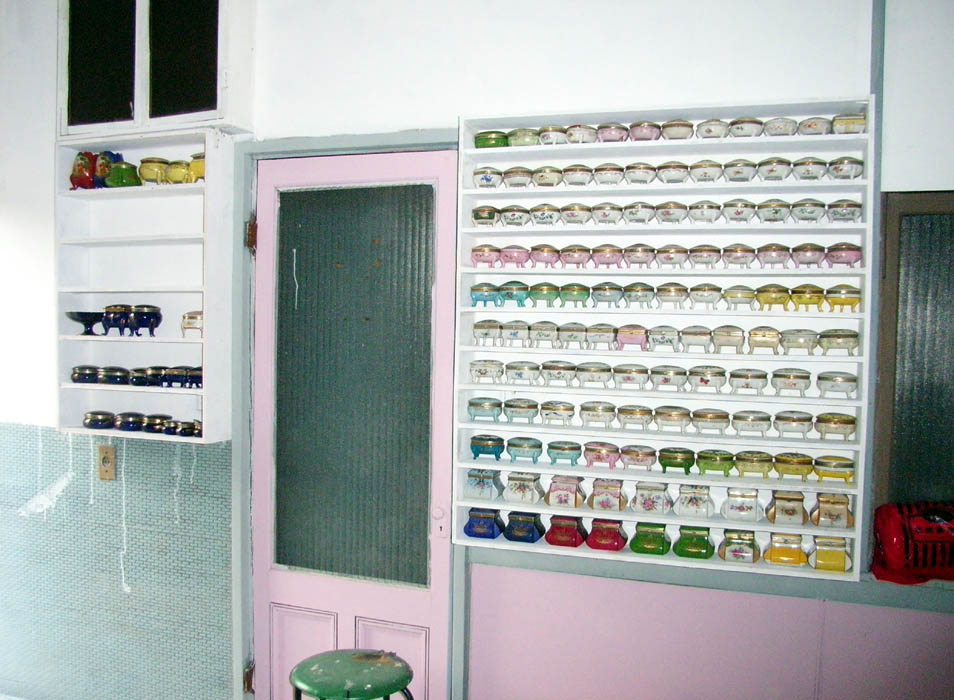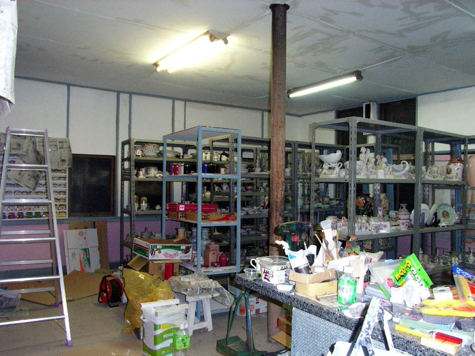 壁用の棚が全て固定されて、小物が陳列されていきます。2階東側の棚も上段2列の塗装に次はとりかかります。塗装が仕上がり、陶器を陳列すれば1階2階ともに壁の収納がとにあえず終わります。