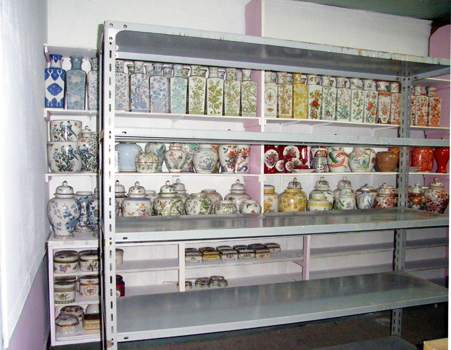 これから棚を壁に固定して小物をおさめていきます。その後、大きなもの、セットものを床置きの棚に収納します。まだまだ棚が足りません。これからが正念場。2階の天井、蛍光灯、サンプルの陳列。大変所が待っています。