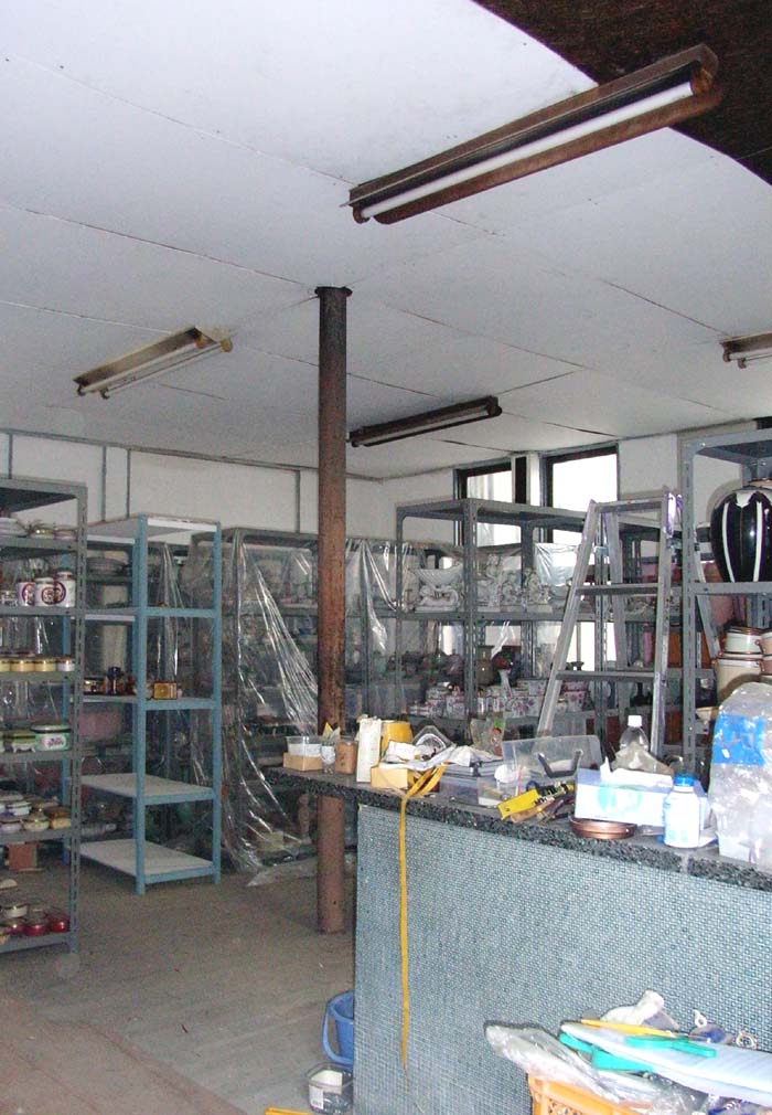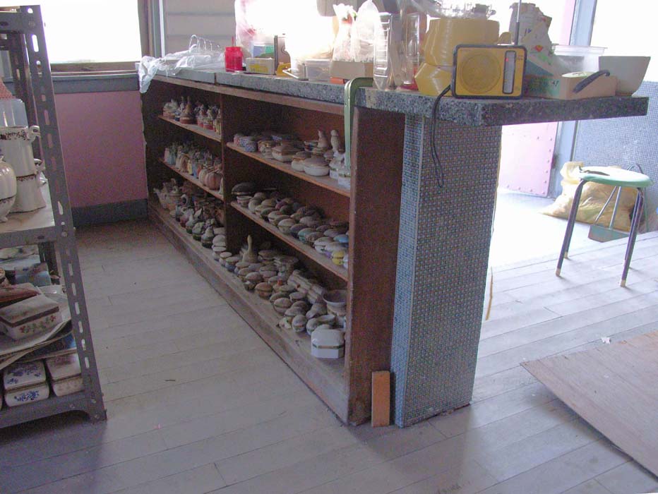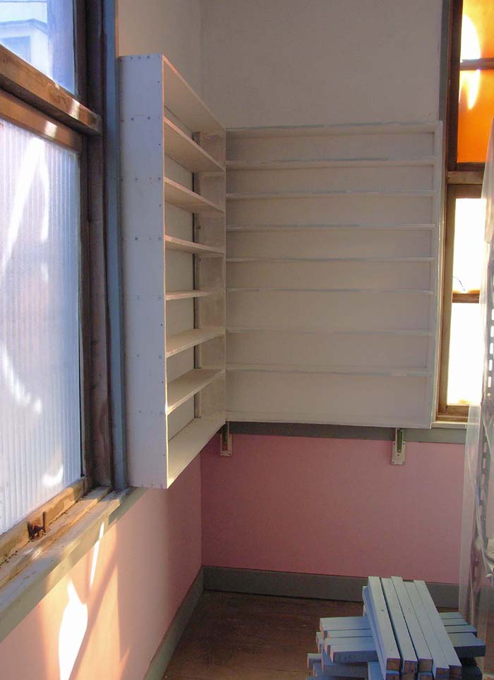 コーナーの棚は全部白色にします。アウトラインをブルーグレーに塗ってみたのですがサンプルがきれいにみえません。白色に塗り直しました。サンプルをキチンとみせることが今回のテーマです。そして、いかに陳列するかが今後の課題です。