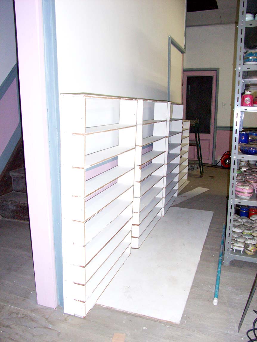 初めて作った棚です。小さなサンプルが沢山あります。小品は壁に棚を作りつけそこに陳列しようと思います。とにかく数が多いのでサンプルを見やすく陳列することを考えながら収納棚を作っていきます。この棚、うまくカウンターの上に収まってくれるといいのですが。
