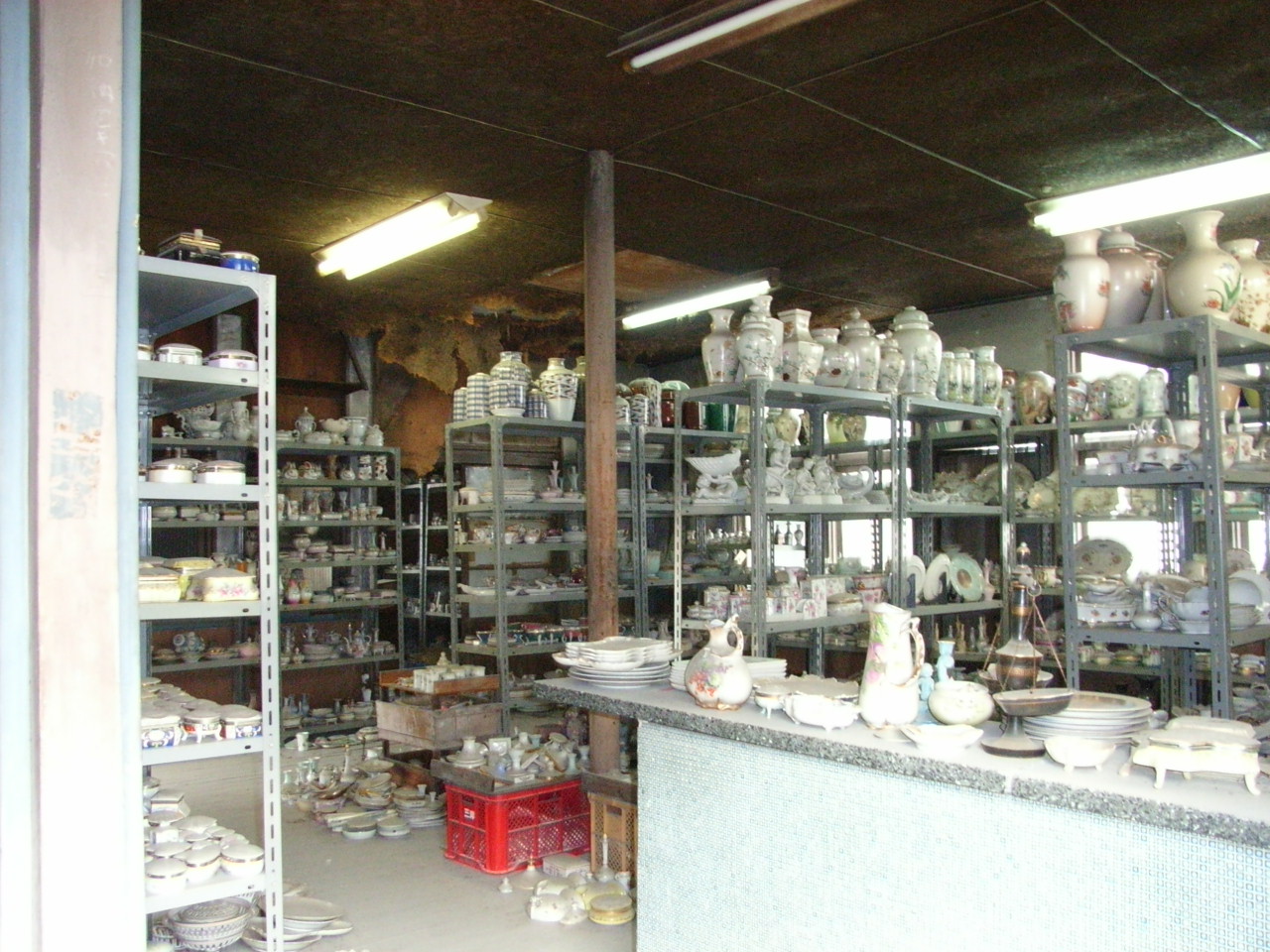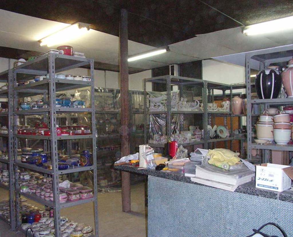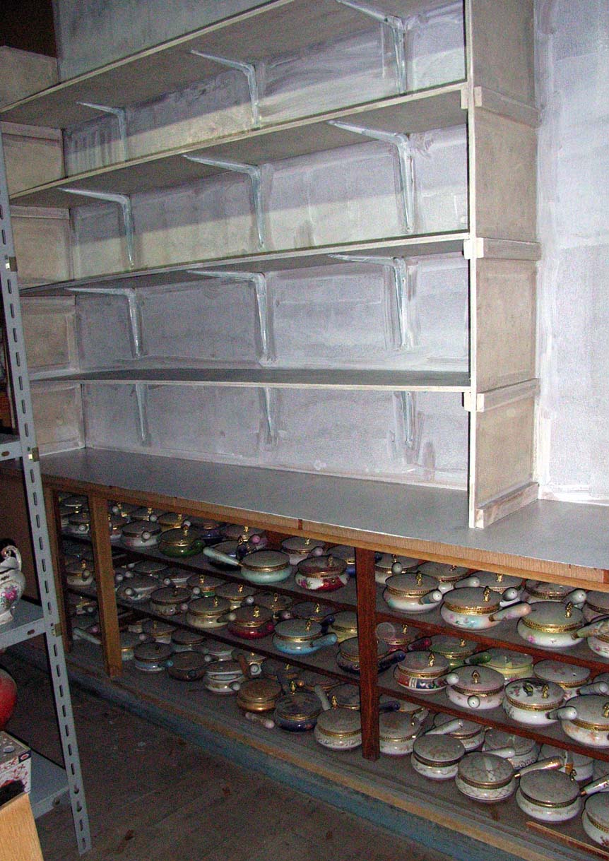 棚の陶器を下ろして棚の塗装をしていきます。ぎっしりと収められいる陶器は年代もののサンプルです。今回の展覧会の主役です。